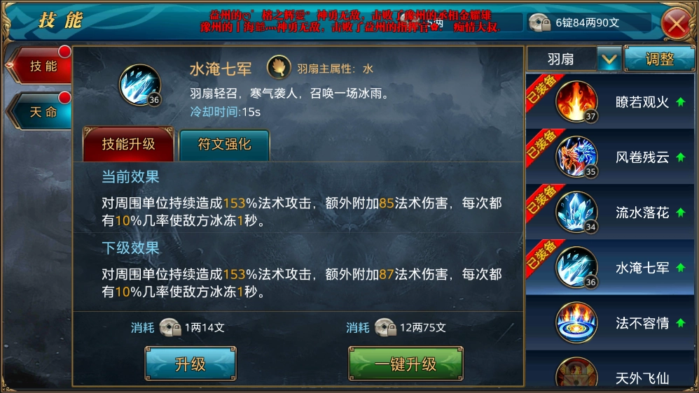 4、水淹七军,同样属于范围技能,不过冷却时间更长,需要15秒。该技能的效果是召唤一场冰雨,对区域内的敌人造成法术伤害,而且每次攻击都有10%的几率将敌人冻结1秒。