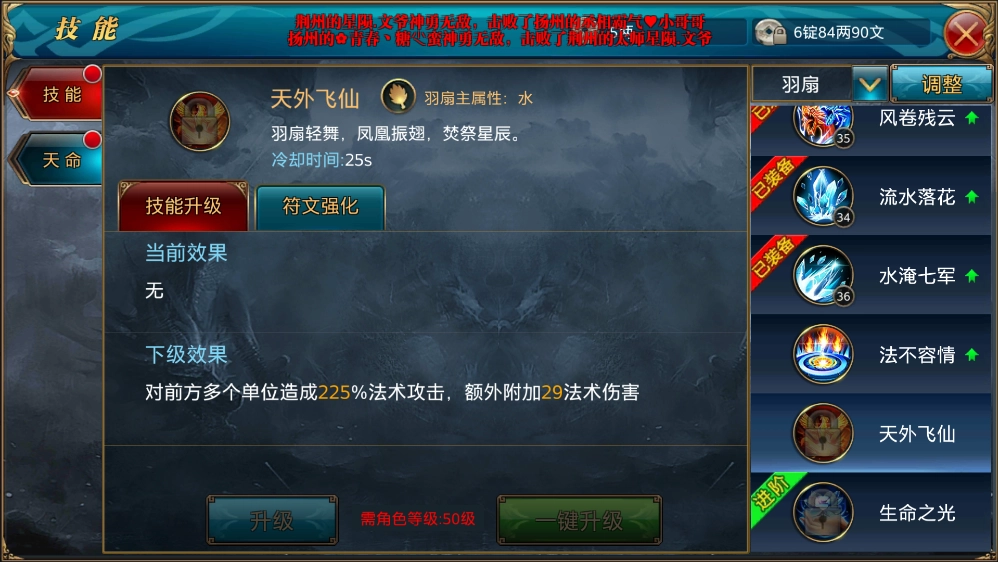 6、天外飞仙,是后期使用频率最高的范围伤害技能,释放后能造成超过200%法术攻击力的伤害,同时还会附加额外的法术伤害。