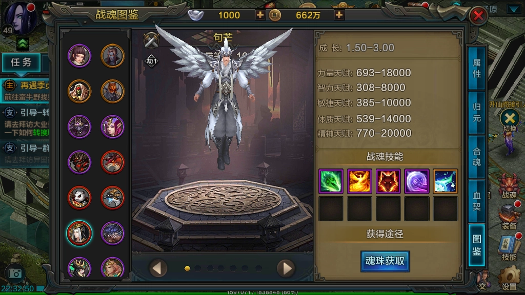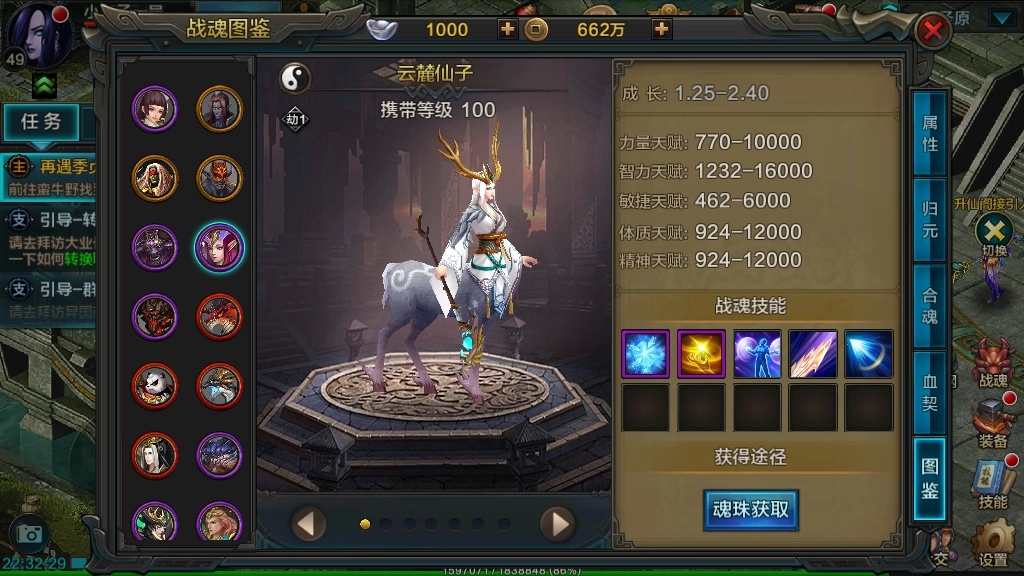 从外形就能看出云麓仙子是法师类型的战魂,她的成长数值和震天雷兽一样,不过智力属性达到了16000,体质与精神则都是12000,所带技能也都是提升法术伤害的,整体而言是个相当不错的法系战魂。