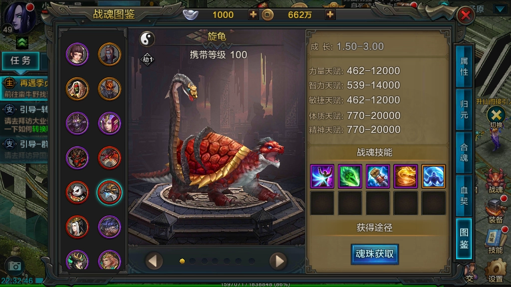 旋龟的体力与精神属性均达到了20000,从这些数值能明显看出它属于防御辅助类型的战魂。其独有的技能“神龟之气”,能够大幅增强自身的防御能力,是一款相当出色的防御类战魂。