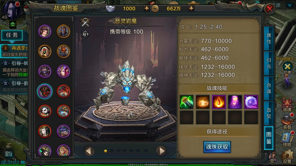 恶灵岩魔的体力与精神资质均达到16000,其他方面资质较为普通,由此不难看出,它属于防御类型的战魂,其技能主要围绕提升自身防御与复活效果展开,比较适合法师职业的玩家携带。