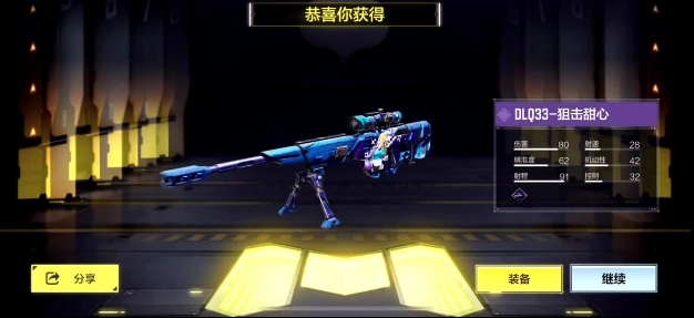 最后要介绍的是狙击枪DLQ33-狙击甜心,作为一把栓动狙击枪,它的单发伤害相当出色,射程表现也十分优异。枪身图案是卡通风格的马尾水手服萌妹子,清新的蓝色配色让人感觉十分可爱。