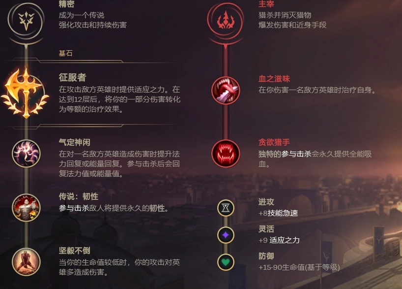 在天赋搭配方面,征服者无疑是最契合人马的选择。主系推荐点出凯旋、韧性与坚毅不倒——坚毅不倒能和人马自身的高回血机制形成联动,让他在残血状态下仍能爆发出可观输出,甚至完成反杀。副系则建议选择骸骨镀层与爆破这两个符文。
