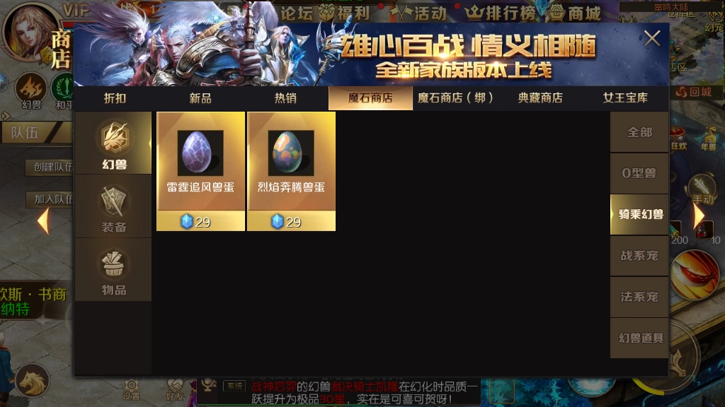 那要怎么得到这类幻兽呢?通常而言,这两款坐骑的获取途径主要是商城购买或者系统赠送。你可以点击商城,在魔石商店里找到幻兽分类栏,就能看到雷霆追风兽蛋和烈焰奔腾兽蛋在售卖,价格也不高,29魔石一个,大概相当于1元钱。另外,系统偶尔也会给我们发放一些幻兽蛋,里面说不定就有这两种。