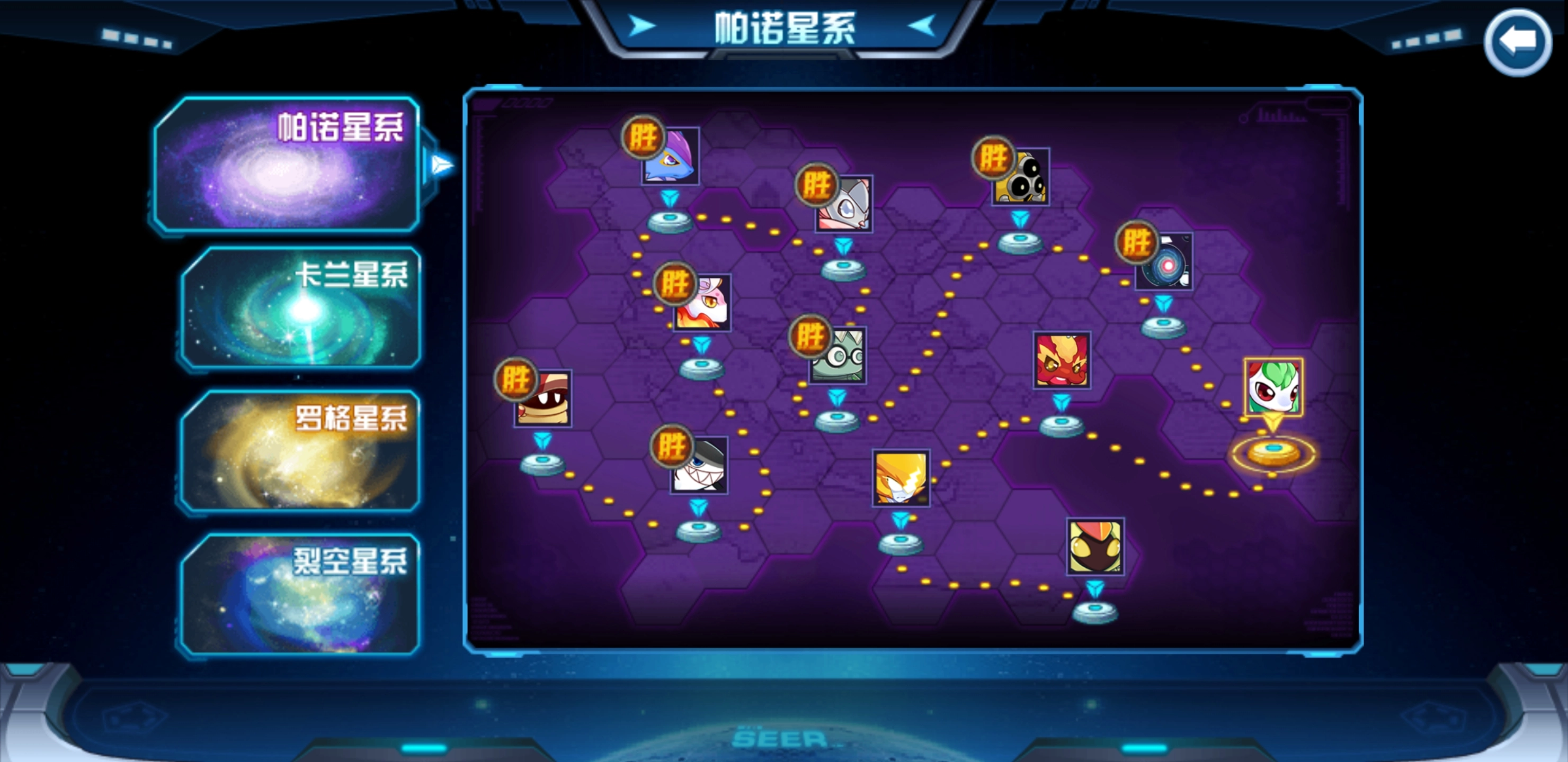 每次进行精灵融合都得用上两个指定的精灵,这些精灵玩家也能通过各个星球的捕捉副本来获取,但前提是得先通关该星球的所有普通关卡才行。另外,每个星球上会出现不少精灵,其中有些稀有精灵的出现概率更低,玩家需要多次挑战副本对战才有机会碰到它们。