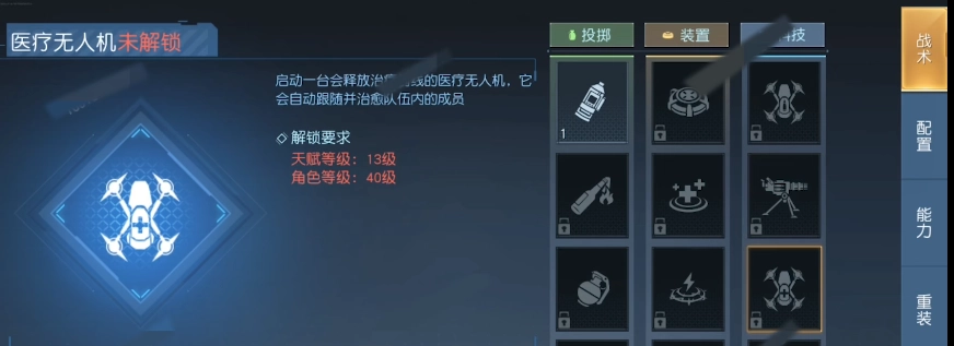 第二个无人机技能名为医疗无人机,从名字就能知道它具备治疗功能。相较于治疗装置,医疗无人机的作用范围更广,灵活性也更强,还能跟随受伤的玩家进行治疗,所以在团队副本里的表现更为突出。