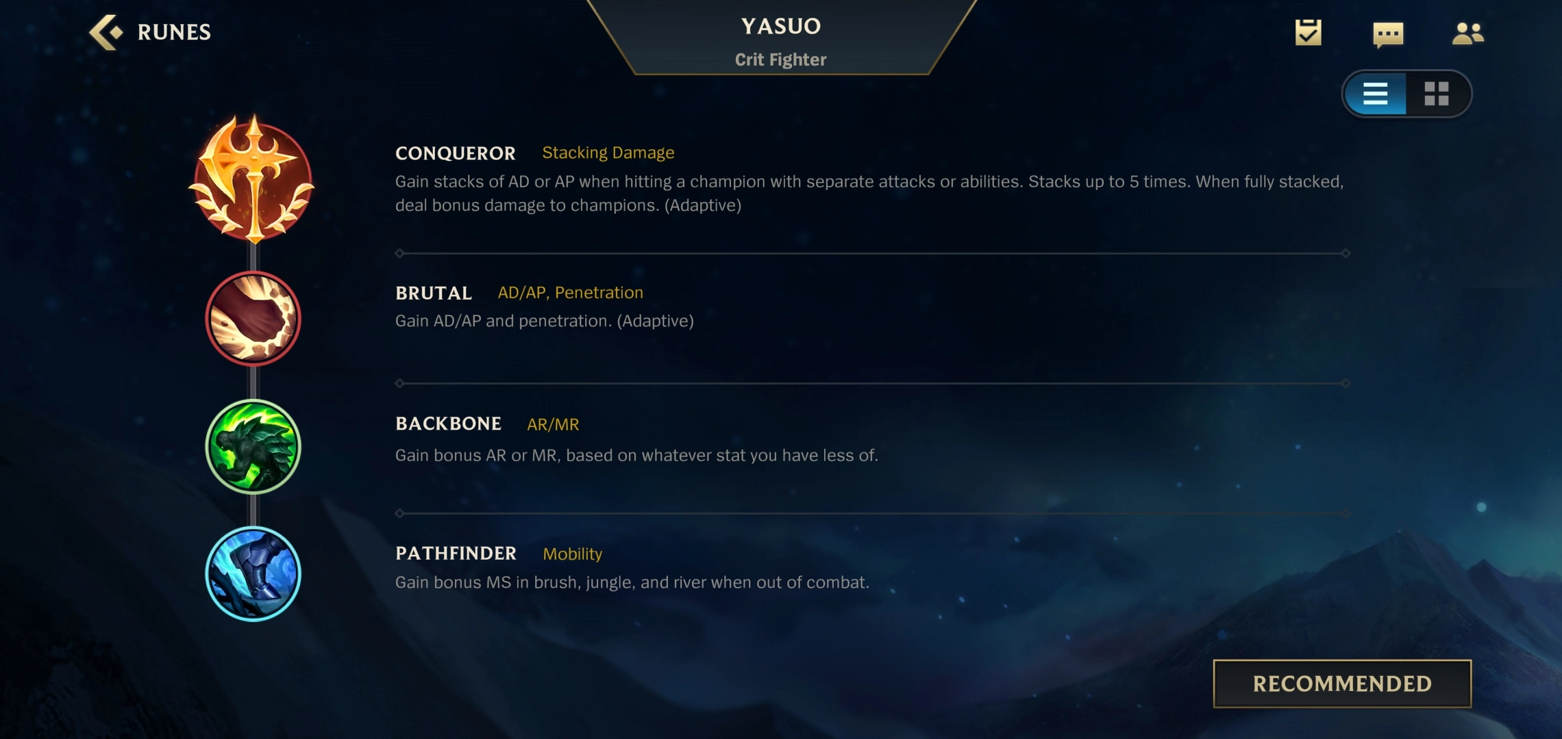 亚索的主系天赋优先选择征服者,这个天赋的机制是在攻击敌人时会逐步累积层数,最多能叠到五层。每层效果能为亚索提供2到6点额外攻击力,或是4到12点法术强度;一旦叠满五层,就能获得10%的伤害提升效果。