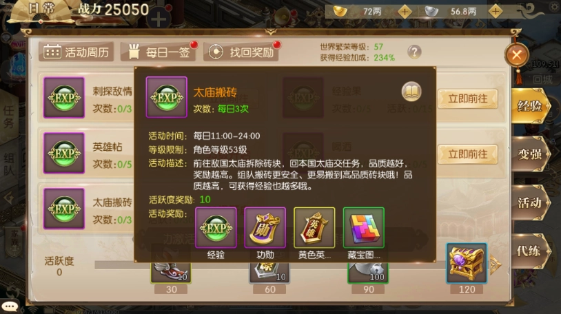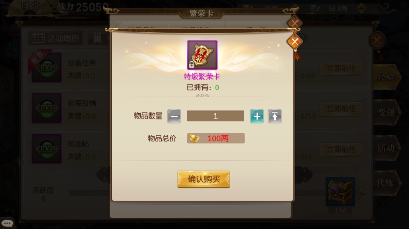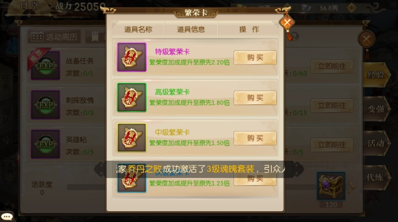 这个方面的话也是需要花费一定的金子的,所以挑最好的买,那么获得的经验就一定的多,最好还是每天的活跃度都刷完。