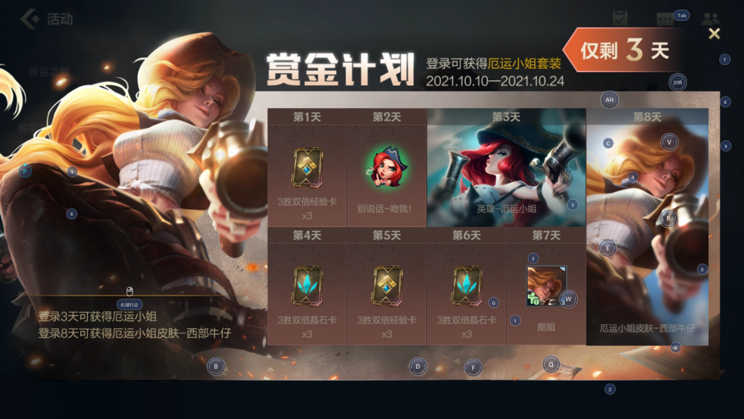 刚接触游戏的新手玩家登录后会发现有个签到活动,连续签到7天就能领取厄运小姐以及她的西部牛仔皮肤,此外还会额外赠送一个姿态。在我看来这个签到福利相当不错,毕竟只要完成签到就能拿到皮肤,大家可别错过,赶紧去参与签到吧。
