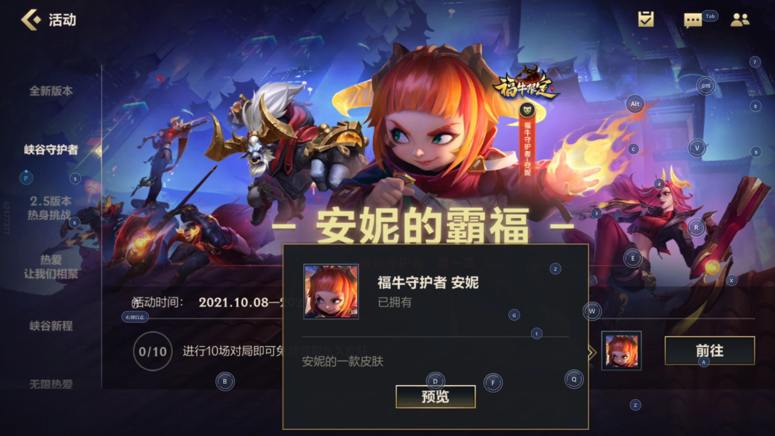 英雄联盟手游目前还处于测试阶段,官方推出了不少福利活动,其中很多都包含皮肤奖励。像之前就有登录即送提莫英雄及熊猫皮肤的活动,要是没能赶上也不用遗憾,现在正在进行的福牛守护者活动同样给力——只要完成十局对战,就能免费领取安妮的福牛守护者皮肤啦。