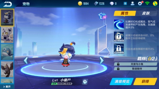 第三点要提的是小僵尸。对灵异题材不太感冒的小编,对这只宠物的感觉挺复杂的。叼着奶嘴、脑门上贴符纸的它,就算长大也没什么恐怖感,反而有种丑萌的反差。作为道具宠物,小僵尸的实用性也不弱——8%的磁铁获取概率和4%的后追加速效果,都是让人忍不住喜欢的亮点。看着它圆溜溜像鸡蛋似的大眼睛,还有头顶那撮小揪揪,小编觉得完全可以放下对灵异元素的抵触啦。