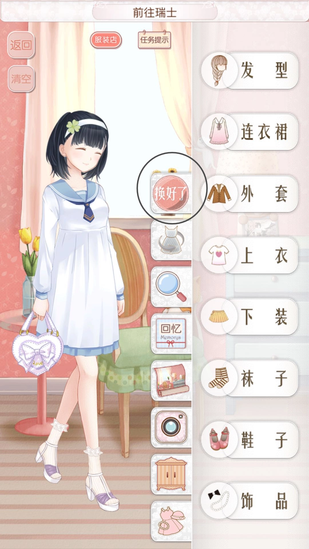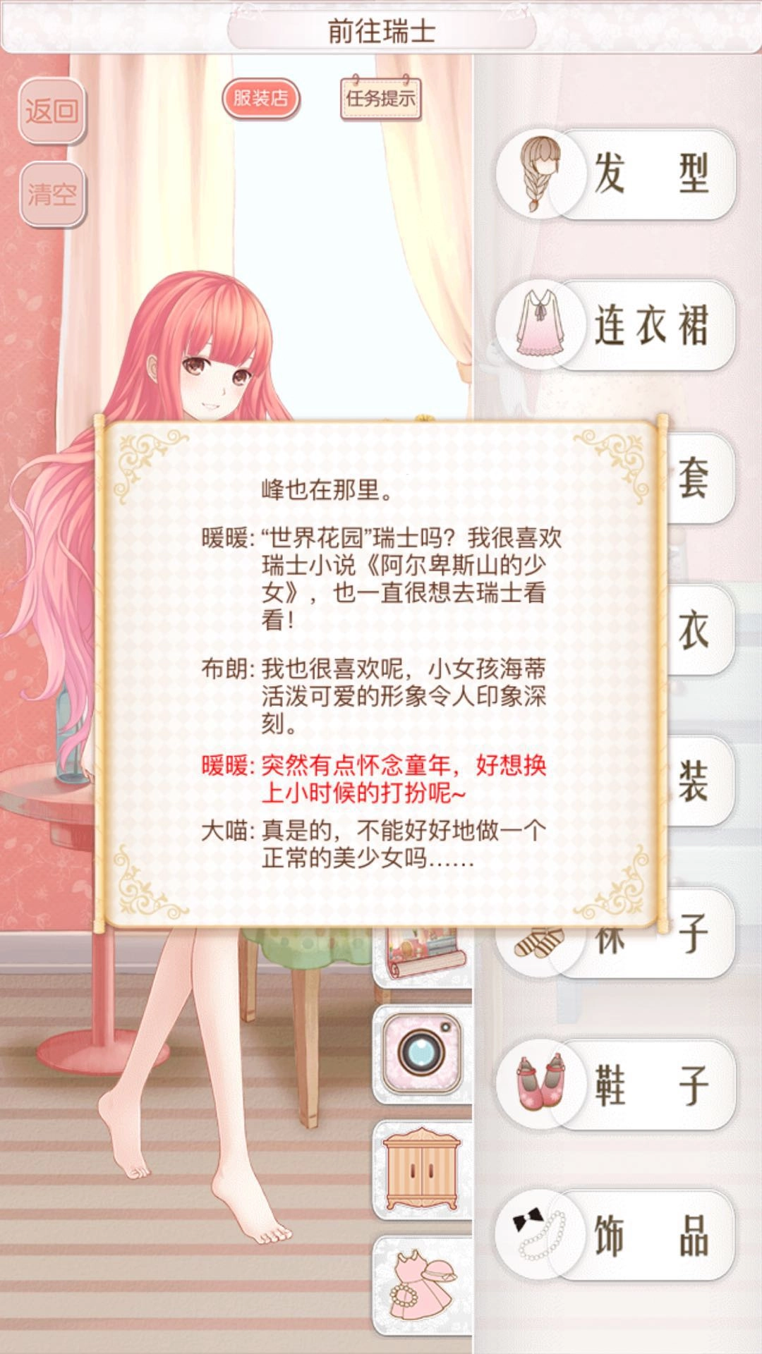 2、能看到这一关的核心是想去瑞士看看,要留意红色字体“好想换上小时候的打扮呢”,所以这一关的穿搭风格要偏向少女感一些就行,千万不要往相反的方向去搭配,不然是拿不到S评分的哦!