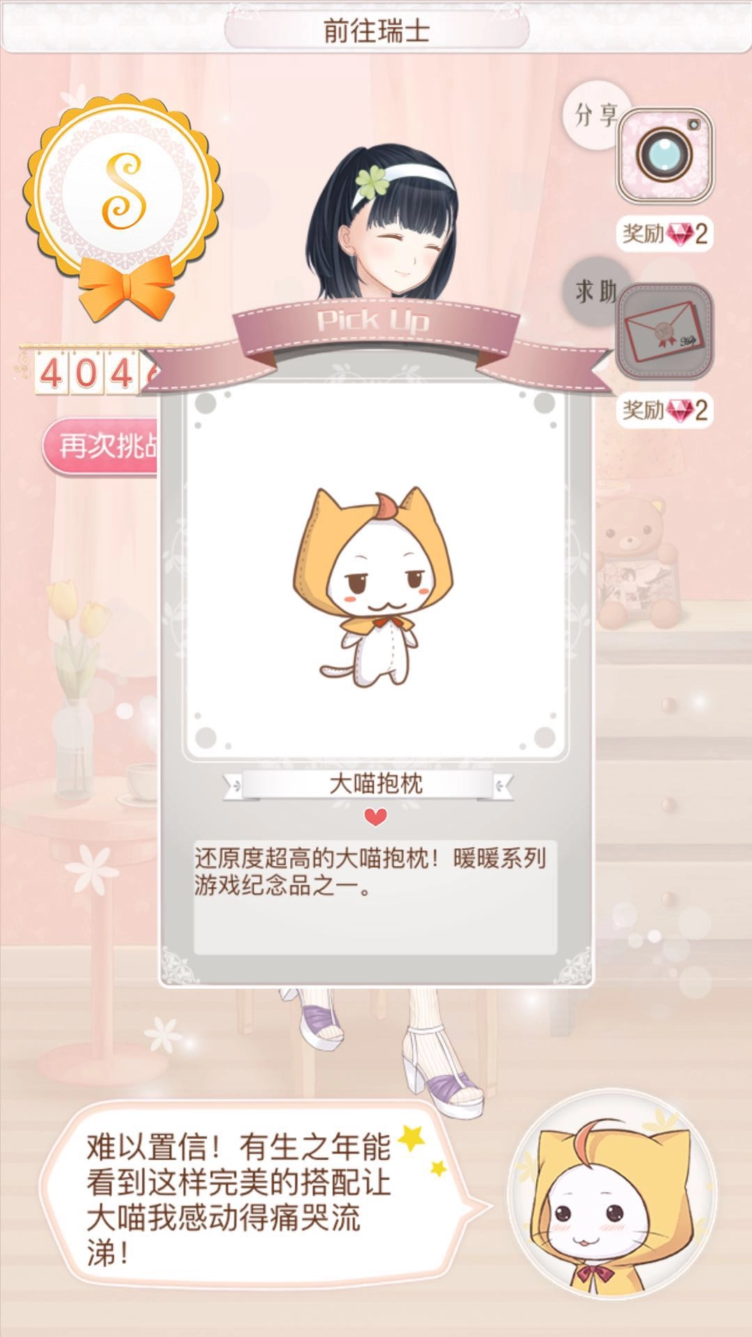 最好能看到,我们拿到了四万多分,毫不费力就把S评分收入囊中,还得到了1000多金币和“大喵抱枕”。这个抱枕可以送给服装店老板娘,等她对我们的好感度提升一些后,我们再去买东西就能便宜不少啦!