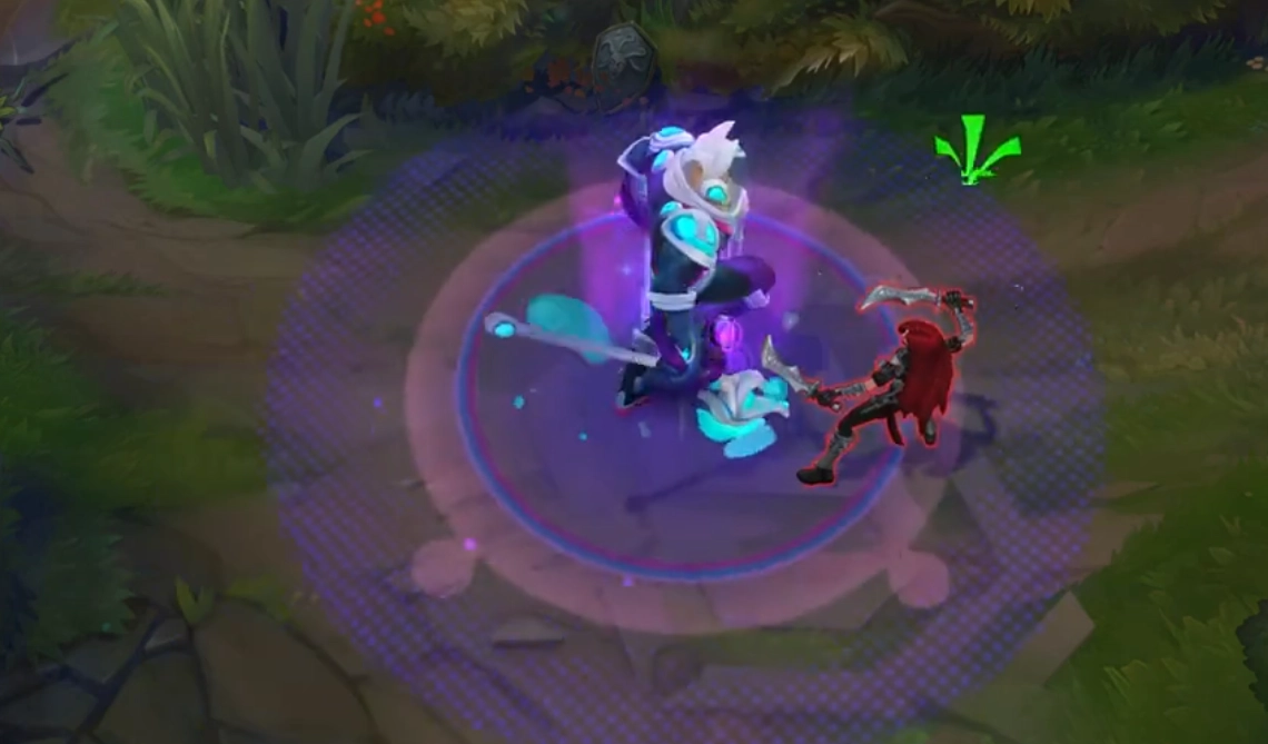 狗头普攻时会带起一阵泡泡,释放Q技能时权杖会裹着一层气泡,砸落时气泡便会破灭。W技能会朝敌人释放一团东西,同时有相关几何元素升起。E技能会释放一个法阵,法阵中间印着狗头图案,四周升腾起彩色泡沫。大招开启后,狗头整个人会变大,并且变成紫色,周身缭绕着泡沫,辨识度很高。