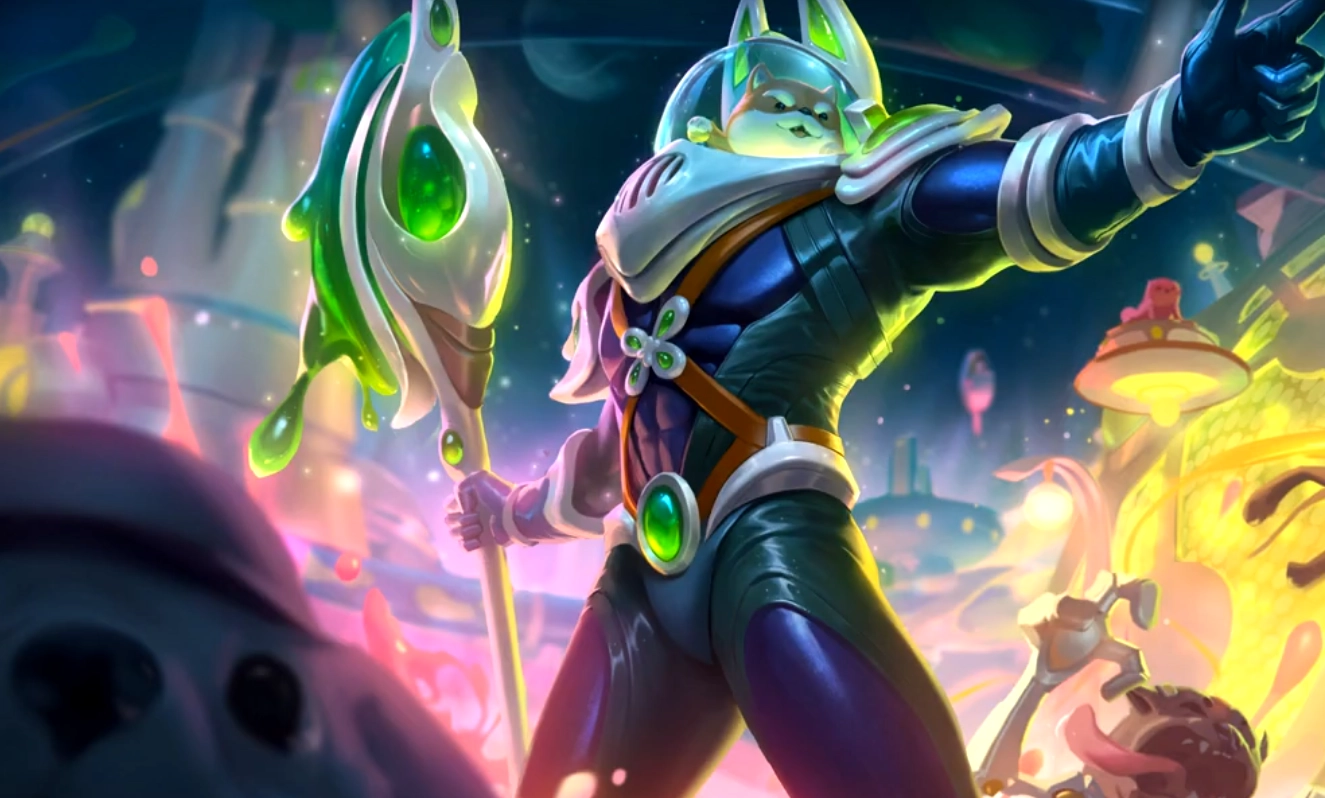 狗头的太空律动皮肤超可爱,整体色调饱和度高还偏亮,看起来精美华丽又趣味满满。它不再是以往严肃的样子,头顶换成了软萌的柴犬头,又萌又好看;手上握着一根淌着液体的权杖,壮硕的身体和可爱的脑袋形成了鲜明反差,特别有意思。