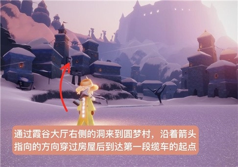 进入霞谷后,要从大厅右侧的洞口进入。需要注意的是,玩家得先解锁1个墓土先祖才能进入这个洞口。进入梦想季圆梦村后,朝着第一段缆车的起点走去。到达缆车位置后点燃缆车机关,就能前往山坡的顶部了。