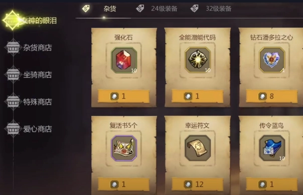 在装备获取方面,玩家可以用女神的眼泪兑换装备,主要对应32级和24级的装备。不过24级套装可通过巢穴的牛头人关卡获取,32级套装也能从巢穴中得到,所以不必急于用眼泪兑换装备,直接挑战巢穴就能快速获取所需套装,无需浪费时间在兑换上。