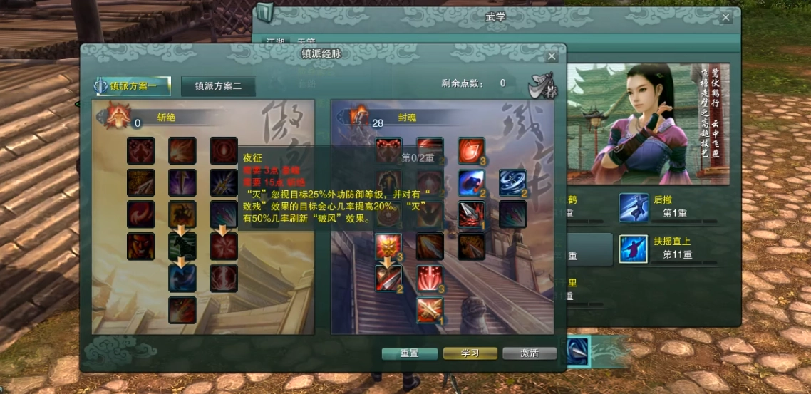 灭:此技能无法在骑马状态下使用,释放时会对自身造成一定伤害,同时对目标造成接近中等水平的伤害。当自身血量低于50%时,对自身的伤害会降低,而对敌方的伤害则会提升。携带秘籍后,该技能的调息时间会增加,但能额外获得免控效果,因此可用来充当免控手段。若点选清扬奇穴,还能附加定身效果,顺便打出一些伤害。
