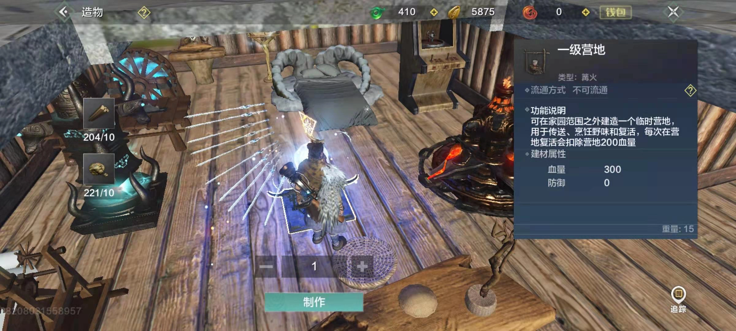 先聊聊临时营地,它的构造十分简单,仅仅是一堆篝火。我们可以在自己的家园里制作多个临时营地并存放在背包中,如此一来,当在野外进行战斗时,只需点击背包里的临时营地,再随意挑选一块空地点击放置就能使用了。要是想更换位置,就在新的地点重新放置一个临时营地即可,之前的营地无需特意处理,等时间到了就会自动消失。