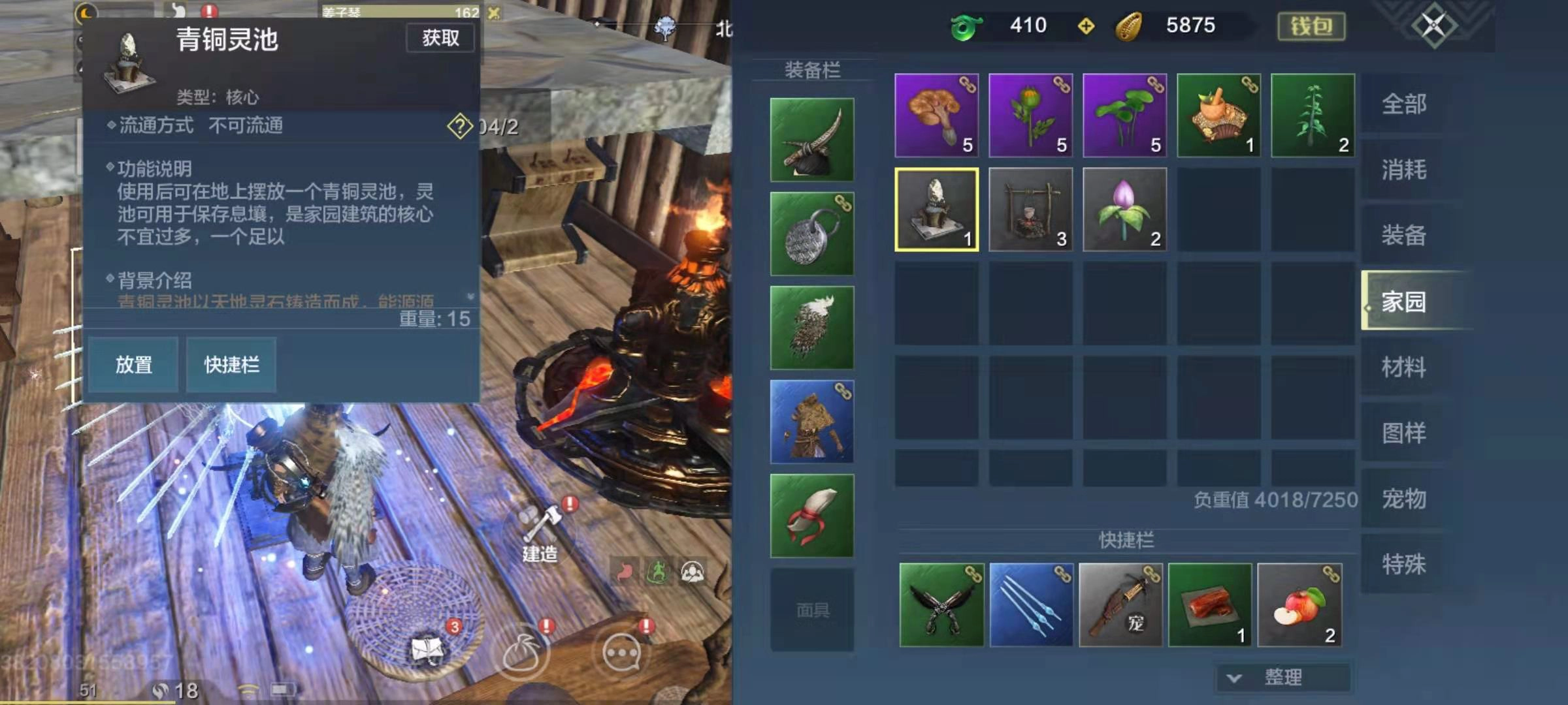 制作好青铜灵池后,就能前往计划安置新营地的地方,接着挑选一处风水佳地,将青铜灵池安置下去即可。此时原来的营地会自动收回,其中的家具、建筑物等物品,都会回到背包里,之后在新营地重新布置摆放就行。
