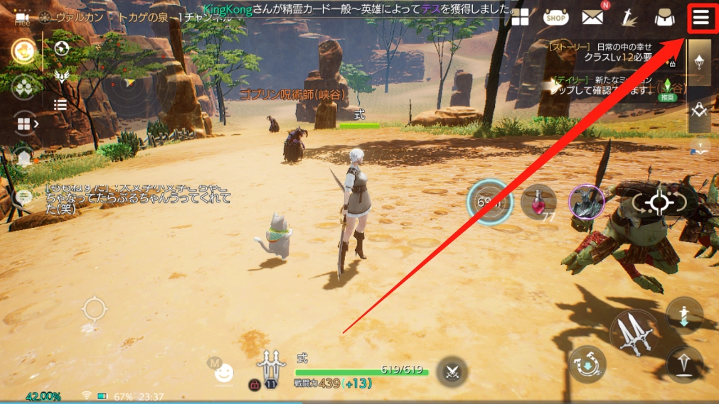 1、点击屏幕右上角的“三横杠”图标,即可进入游戏菜单界面(已在图中标注位置)。菜单里那个类似“骷髅”样式的图标对应的是副本选项,点击该图标就能进入副本。需要说明的是,当前游戏仅支持韩文和日文显示,所以相关操作位置已在图中为大家标注清楚。