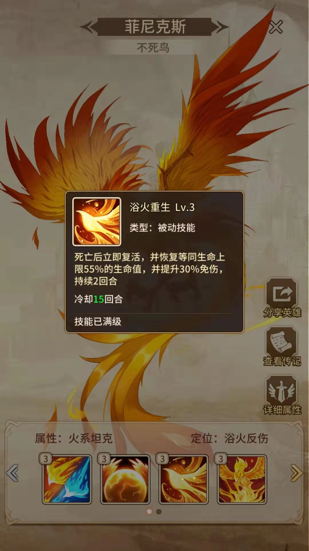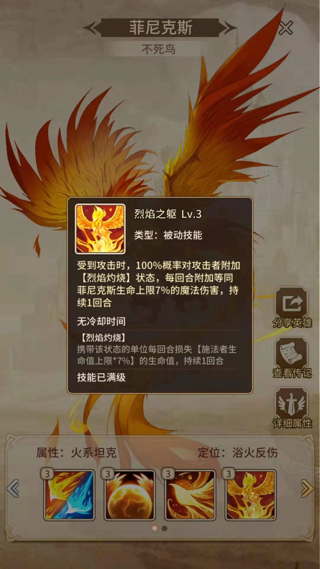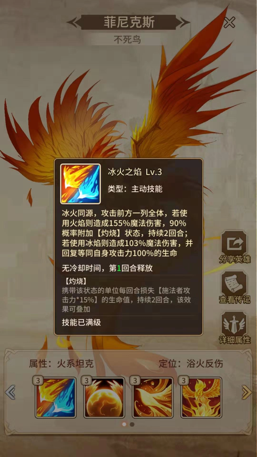 在了解了菲尼克斯的技能后,我对他适合搭配的阵容已经有了清晰的思路。这套阵容主要有两种构建方向:一种是以复活或禁止复活为核心机制的复活流派;另一种则是通过叠加【灼烧】与【烈焰灼烧】效果来打伤害的烧血流派。