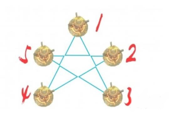 我们把正对着游戏玩家正前方最上方的石柱编号设为1,然后按照顺时针方向依次进行排序,具体情况如图所示: