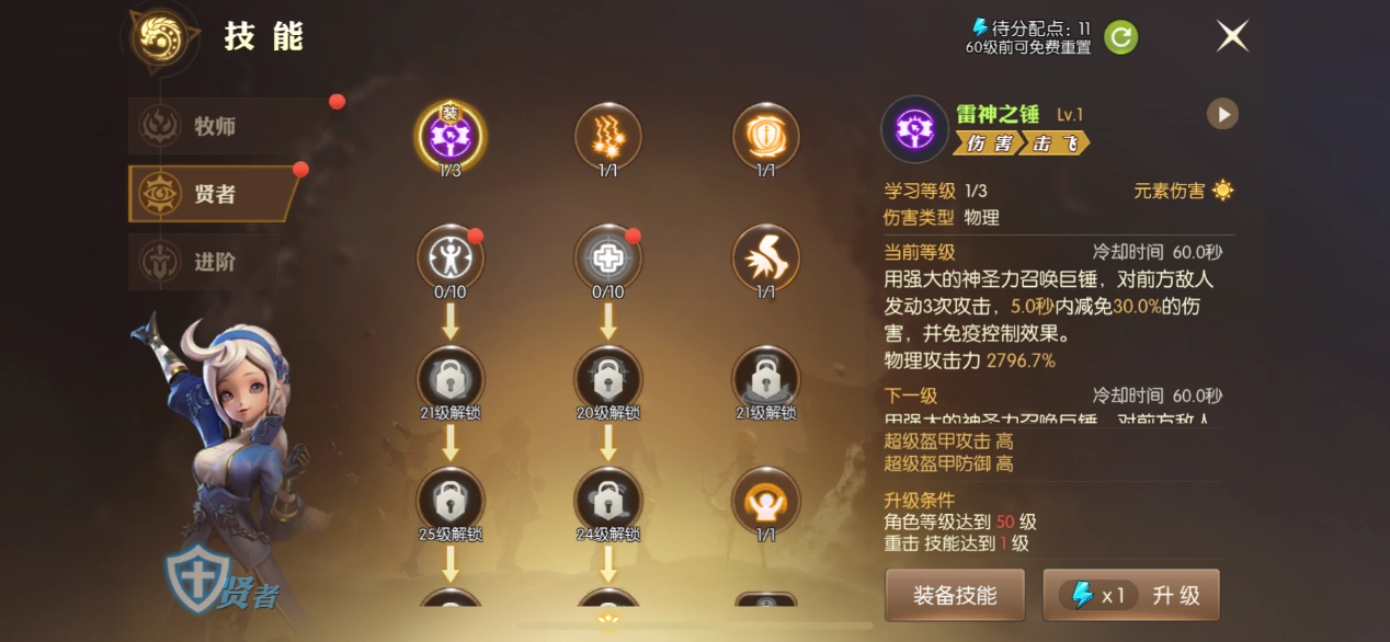 2.副本任务:建议把圣光锤和雷神锤都点满,像巢穴这类副本对伤害要求较高,所以选择大小锤是比较合适的,这些技能能提升群体伤害效果,因此推荐全部加满。
