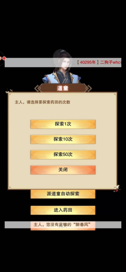 道童在门派宝库界面的右上角。每次进入该界面需要消耗一瓶醉清风,醉清风可通过门派贡献在门派宝库中兑换获得。废弃药田的探索方式分为手动探索和自动探索两种。