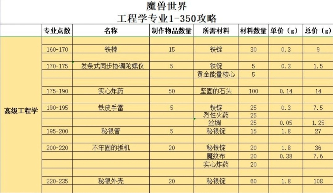 和其他任务不一样,工程学升级并不困难,只要准备好对应的材料,找到NPC,接着持续铸造道具,就能提升职业等级了。在这里,小编为各位玩家整理统计了工程学从1级升到300级所需准备的材料以及升级过程中需要锻造的道具清单。