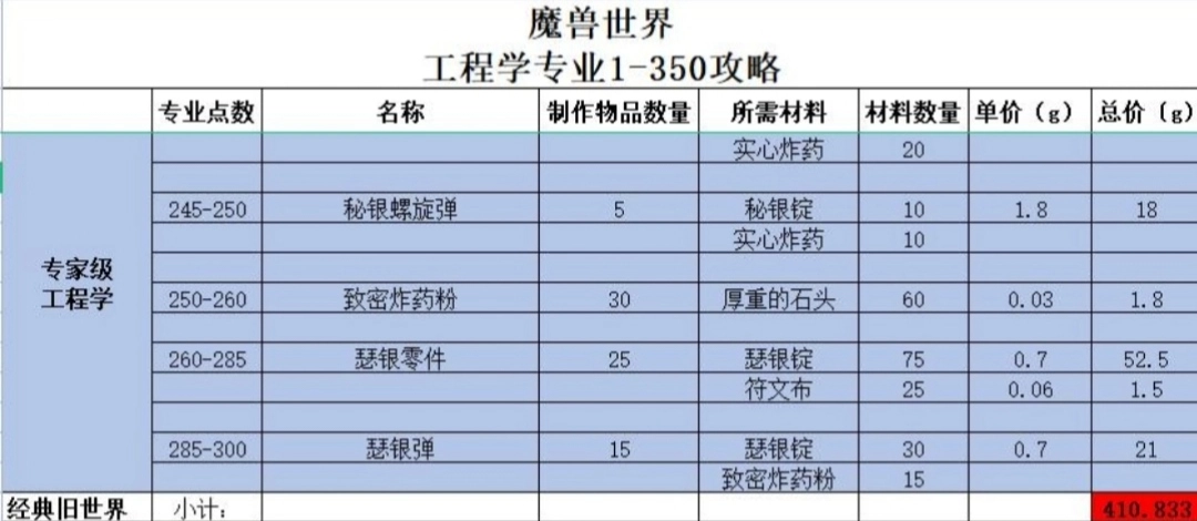 235到300阶段需要制作的物品包括秘银螺旋弹、致密炸药粉、瑟银零件以及瑟银弹。原本我还准备了300级之后的相关内容,但考虑到300级之后其实没有必须练习的需求,所以这里就不再提及了。