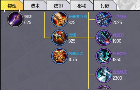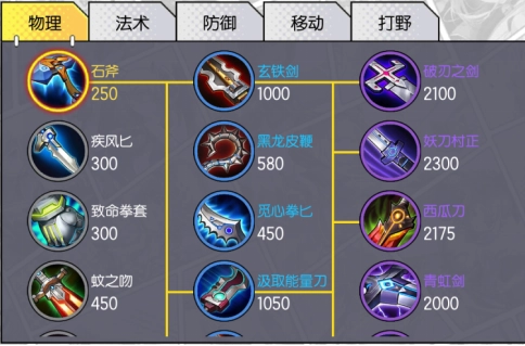 这类装备主要为英雄提供攻击力、护甲穿透、吸血等属性加成。在物理装备类别里,低级装备共有五件,它们分别是石斧、疾风匕、致命拳套、蚊之吻和铜剑,而石斧是物理属性英雄的专属出门装备。