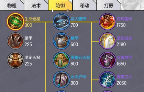 这类装备和前两种不同,没有特定的专属适用对象,能适配所有英雄,因此使用频率也是最高的。在防御类装备里,低级装备总共有三件,分别是生命结尾、藤甲和坚定头冠,其中生命结尾常被不少英雄作为出门装备选择,它能为英雄增加150点的生命上限。