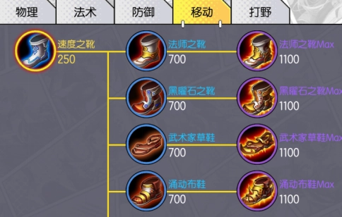 移动类中一共有五件中级装备,它分别是法师之靴、黑曜石之靴、武术家草鞋、涌动布鞋和疾风之靴。这些鞋子可以再一次升级为Max等级的装备。