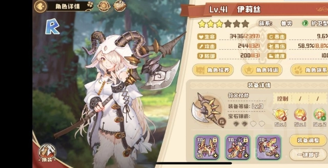 不过,上面提到的角色里,人马因为我抽出来了就先不说,另外三位我都没有。考虑到织毛衣被削弱了,加上秉持着有什么用什么的原则,伊莉丝就成了我的首发主T。虽说现在我的资源大多倾斜到双C和人马身上,但41级的伊莉丝还是有着这样的面板: