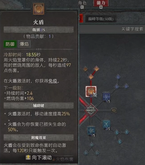 第二个要点是挑选合适的技能,这当中最关键的是技能点的分配问题。在此建议大家优先把点数加到火焰弹与火盾上,火焰弹作为火法的核心输出技能,不仅有着不错的伤害量,还具备一定的穿透效果;火盾则不仅能提供免疫状态,其生成的环绕火圈也能起到间接的保护作用。