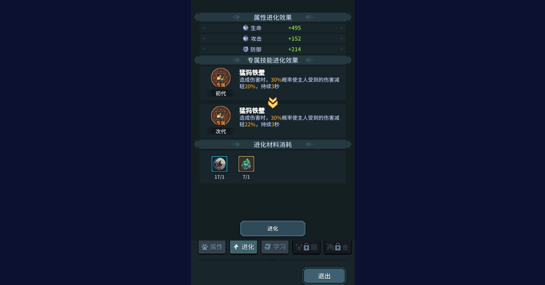 大部分守护系契约兽的进化所需物品都比较相似,主要是该契约兽的精华以及对应类别的巨心。这些材料通过多刷怪物就能掉落,获取起来相当容易。还有铁角猛犸也不建议学习其他技能,性价比实在不高,只能等后续版本更新后,再观察这只契约兽是否有崛起的可能了。