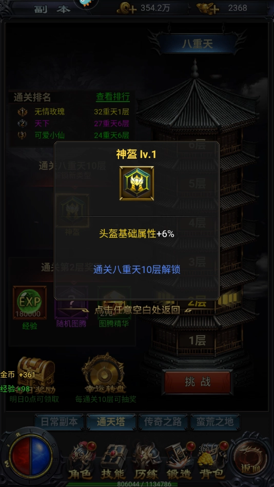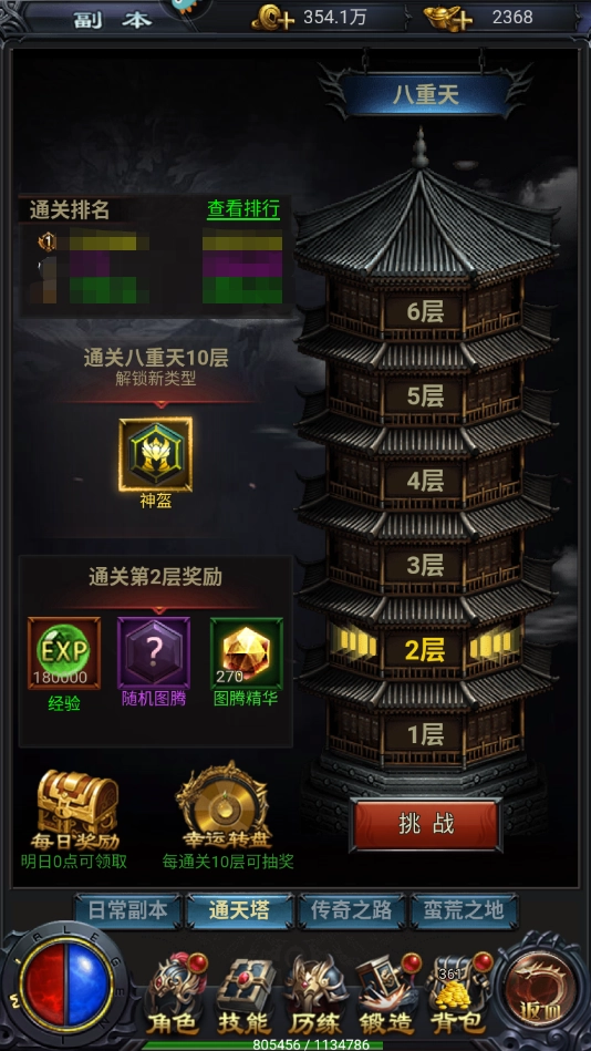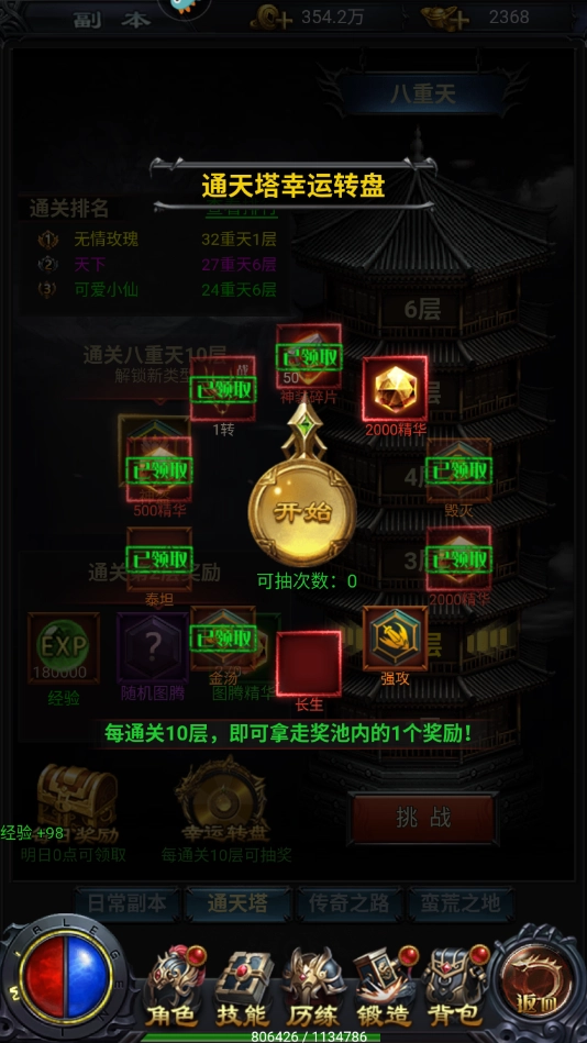 2、通天塔以十层为一重划分,每通过一重,怪物的战斗力就会显著增强。而且每突破十层,还能获得特殊奖励,像解锁图腾位置这类奖励,堪称提升战斗力的关键所在——多一个图腾位置,就能带来相当可观的战力增幅。