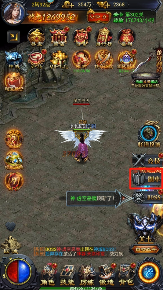 1、玩家达到对应等级后进入游戏主页面,接着点击画面右侧的副本按钮(小编已在图中标注),下方第二栏即为通天塔副本,点击进入就行。