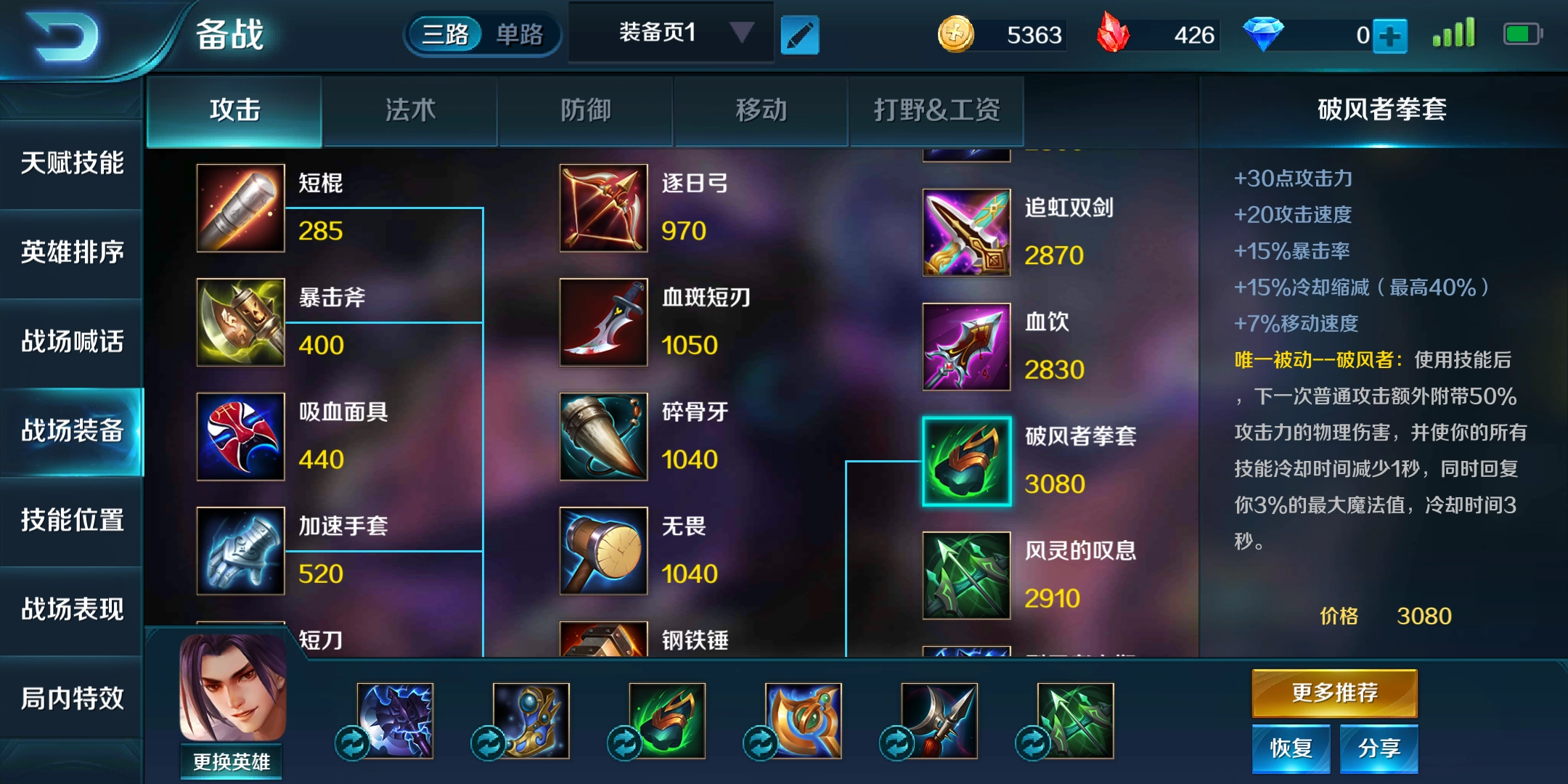 太史慈的被动技能会使其进入三秒内普攻必定暴击的状态,所以第二套出装思路是走暴击流派。前期先出裂甲者之怒,借助频繁换血来压制对面上单;中期再做破风者拳套,释放技能后能提升下一次普攻50%的伤害。