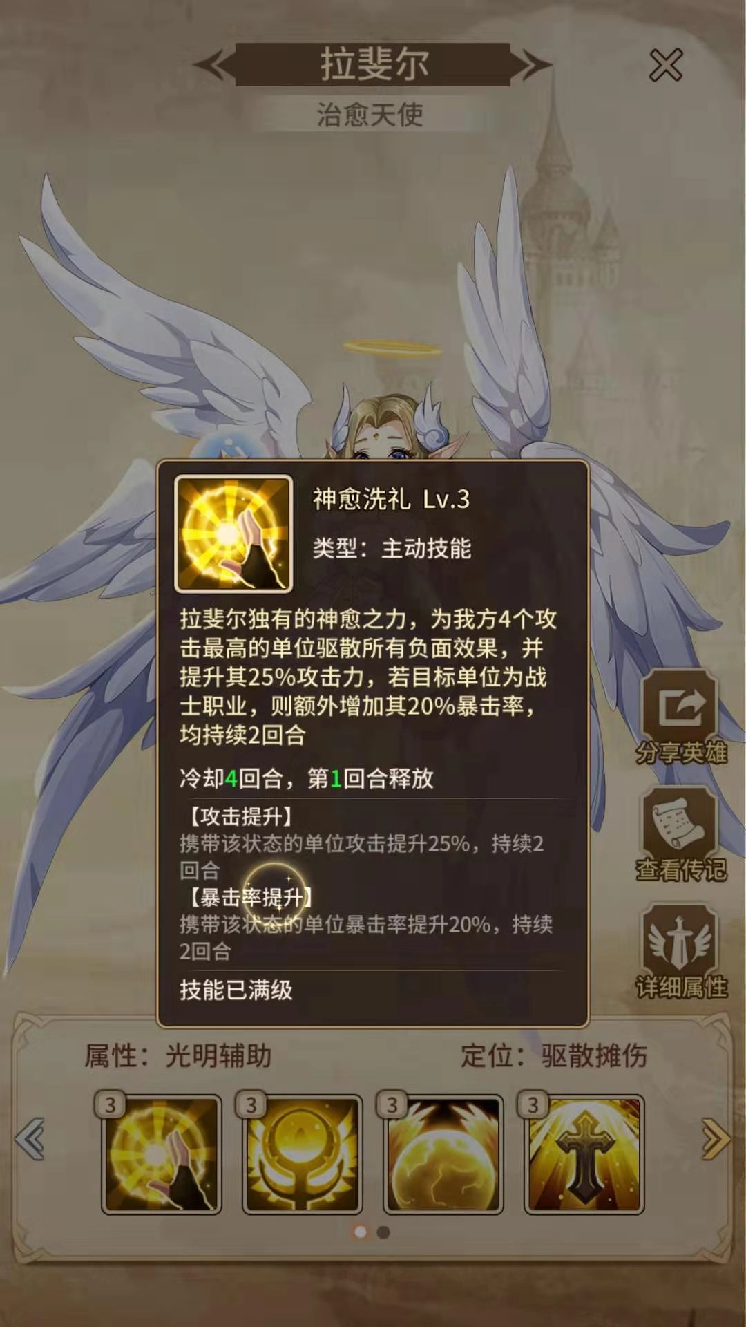 驱散的作用是清除负面状态,其生效范围覆盖四个英雄,而一支队伍总共也就五个英雄。要是目标为战士,还能额外提升暴击率,因此拉斐尔比较适合与战士搭配组队。
