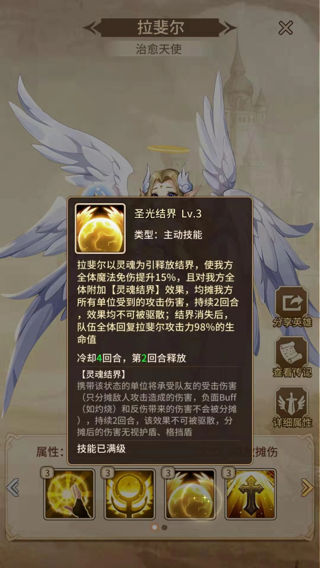 拉斐尔的摊伤说的就是这个技能的效果,目前游戏里好像只有他有平摊伤害的技能。而且摊伤结界结束后,还能给队友来上一口超大的治疗量,说不定对面打得正抓狂呢,拉斐尔一口就给奶回去了。