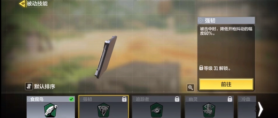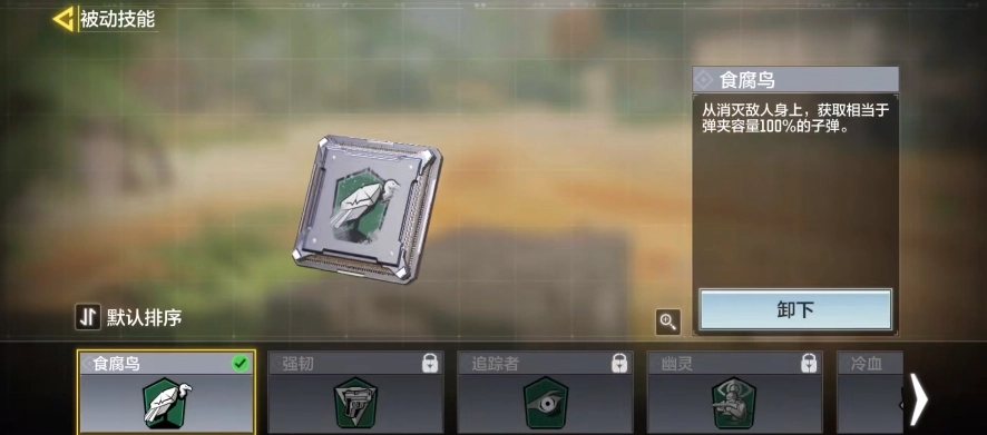 绿色被动技能推荐选择食腐鸟和强韧,这两个都是新手最适用的被动技能。食腐鸟可以为玩家补充弹药,在使用高耗弹武器时作用特别突出;强韧则能提升玩家交火时的枪械稳定性,搭配74U这类武器几乎能消除后坐力,效果相当好。
