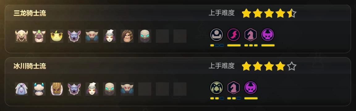 六骑三龙是当前版本的强势阵容,成型后稳定锁定前三,在法师阵容较多的对局里表现格外突出,非常适合用来冲分;不过这套阵容的输出高度依赖龙骑,所以龙骑士的等级必须保证二星,并且要尽量追三,偶尔运气极差时,很容易因为抽不到二星龙骑而直接崩盘。