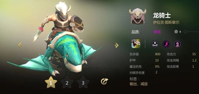 龙骑的星级决定着它的战斗能力,二星龙骑成型后就足以打进决赛圈;当阵容整体星级偏低时,龙骑升到2星即可使用;要是阵容成型且经济充裕,也可以提前留着备用。