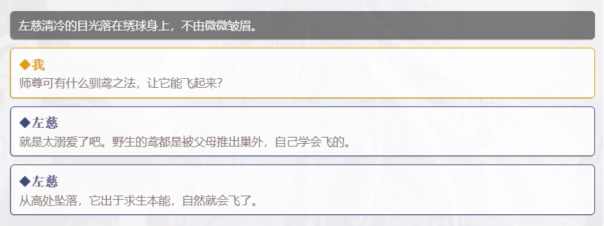 首先,你会遇到一只名为绣球的绣云鸢。这是左慈赠予你的宠物,亦是他向你传递情感的方式之一。若你喜爱绣球,且时常与它嬉戏、投喂、照料它,便能提升左慈对你的好感度。不过要留意,绣球很容易发胖,一旦它体重过重,就会无法飞翔。此时,你得请左慈帮忙训练它飞行,这样还能触发一些有趣又温馨的剧情。