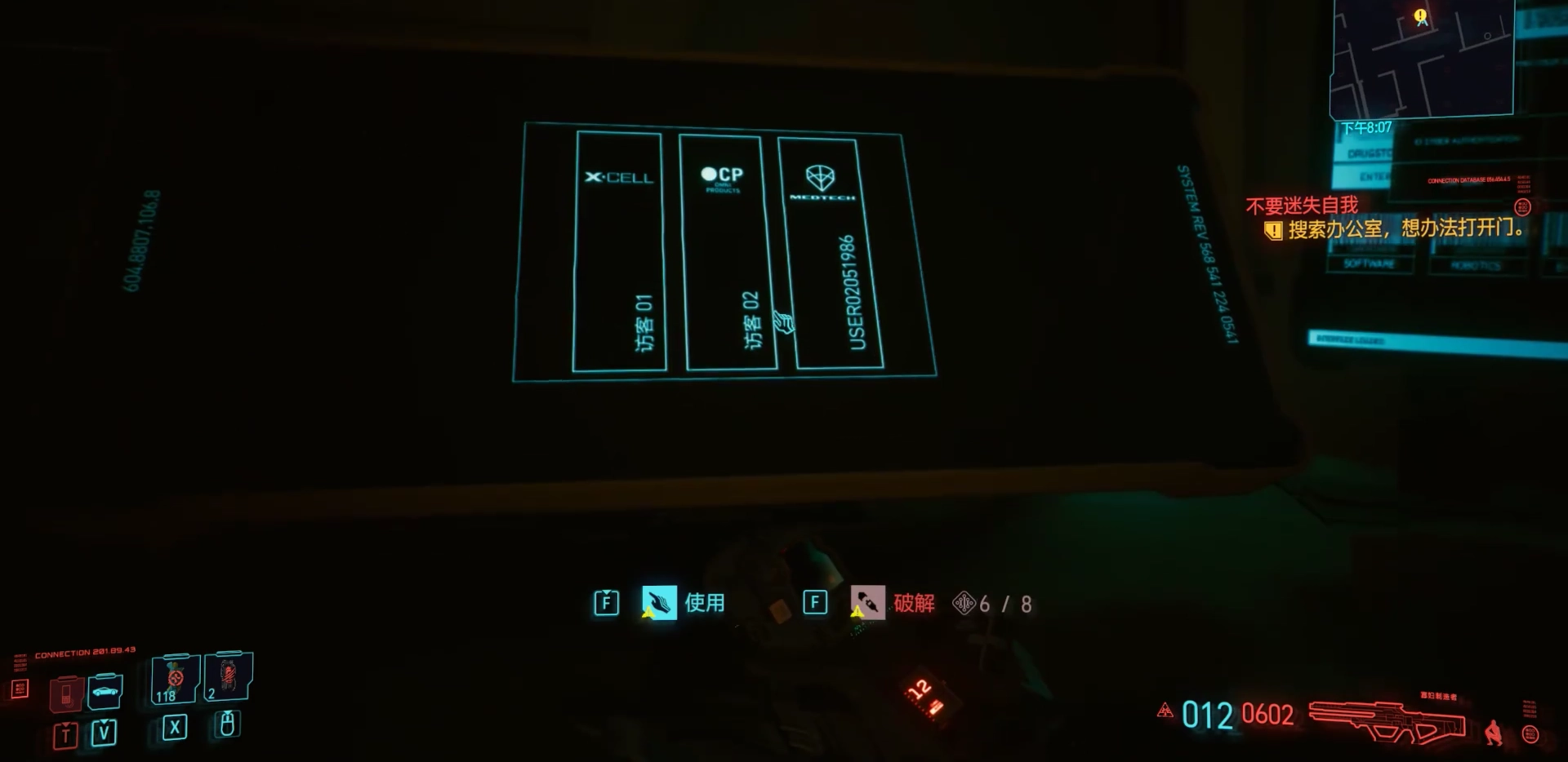 当玩家进入第一个办公室时,会遇到需要的电脑,若无法这台电脑,大门就无法打开。这里要求玩家拥有8点黑客点数,不过即便没有也无需担心,因为密码是1234,直接输入密码同样能够打开大门。