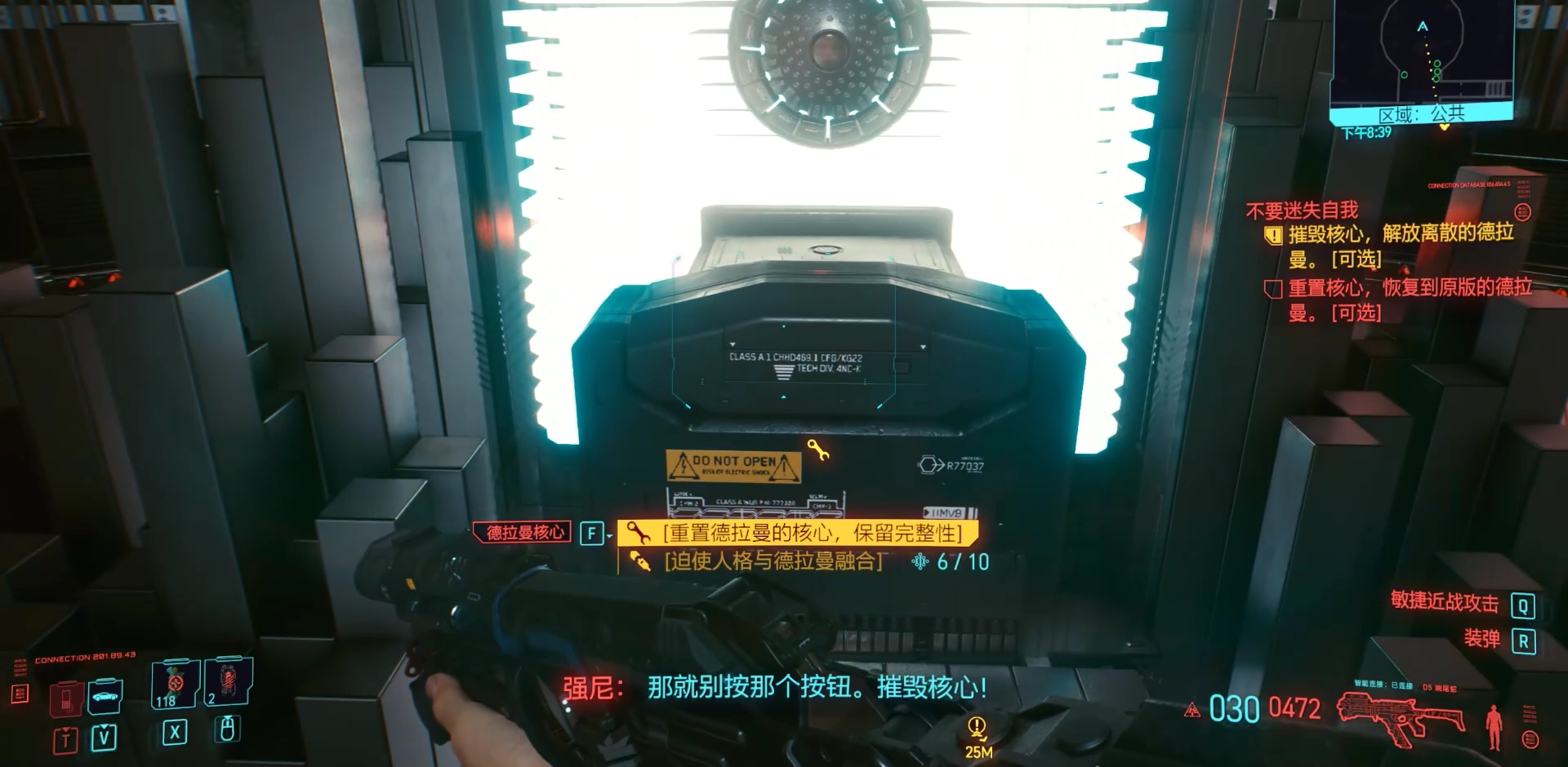 进入控制室后,强尼会突然出现,让V去摧毁核心,但这时最好别听从他的建议。不听从强尼的话,玩家还剩下两种选择:一是重置德拉曼系统,二是融合所有德拉曼(此选项需要10点黑客点数)。实际上并不存在所谓的完美结局,最终选哪种方案完全取决于玩家自己的想法。