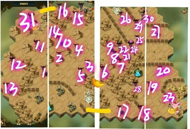 重难点汇总:鸦巢峡谷看似一目了然,直接按顺序打就行,实则内里危机四伏、陷阱密布……这张图的核心要点有三个:其一,我标注元宝的中央位置能启动隐蔽通道(黄色区域已标出),但前提是必须先清理完周围的杂兵;其二,右侧23号对手处(我标了老鼠的地方)是敌方的粮草后备营,买通这里后地图上所有野怪都会掉三分之一的血,效果看似很强,但boss却非常难打;其三,左上方31号对手(同样标了老鼠)暂时不用急着打,因为这是个大陷阱——一旦攻击,就会被一大群180、190级的天降敌人死死包围,其实从开局的对话也能看出这里的危险性。最后要注意:打24号之前必须击败31号!否则24号会无限刷新!而且打31号之前一定要先开启隐蔽通道,这样打不过还能撤退……全图概述:全图共32关,有一关忘标了(〃∇〃),在15号附近是一队绿裔;地图上有三个佣兵营地、两个复活点和两个温泉;敌人多以蛮血为主,且输出强悍,务必找一个能扛住伤害的前排。阵容剖析:我觉得这张图如果能利用好初始的佣兵营地,基本就成功了三分之一。前期怪物多是蛮血和亡灵,后期boss级敌人基本全是蛮血……所以首先得有高输出的耀光英雄,佣兵营地能刷到龙弓;比龙弓更厉害的是冰魔,它是目前输出最强的英雄,刷出几率还挺大。另外,如果你有肉坦(这张图的前排必须够硬),可以再选辅助双子星,能大幅提升输出效率;如果没有肉坦,建议选一个血厚抗打的英雄,提达斯我用着也不错。六、破碎之墟