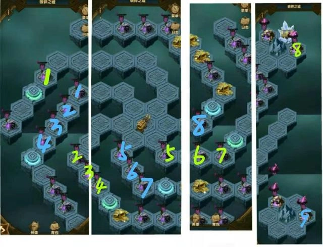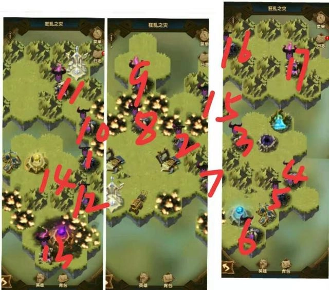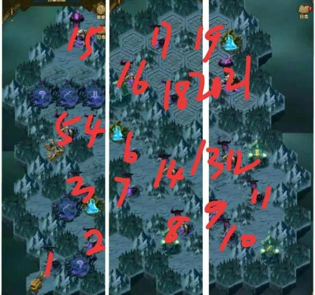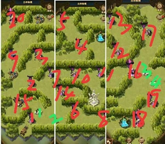 重难点汇总:这一关的地图其实并不复杂,麻烦的是不断蔓延的藤蔓和隐蔽的通道。首先处理藤蔓时,必须按照下图1-5的顺序攻略,因为前四关无论攻击哪里藤蔓都会继续生长,要是第五关没打序号5的位置,藤蔓就会完全长成,想拿艾雅装备只能重新开始了~~全图概述:这张图一共有二十关,两个佣兵营地和一个复活点。图里的敌人阵容比较杂乱,几乎每个阵营都有,但最强的还是亡灵和蛮血。阵容建议:绿裔+耀光的搭配最适合这张图,绿裔英雄必须有三个或以上,否则无法开启迷宫的隐蔽通道。没有绿裔的玩家一定要先去佣兵营地刷绿裔。重点是第十五关,这是新通道的转折点。敌人阵容是两个绿裔猫女、两个羊和一个鹿,强度不算特别高,但难点在于必须用三个绿裔英雄打完。实在没绿裔的可以打两次:先上其他英雄当炮灰磨血,再放三个绿裔收尾。这个方法只建议战力高或英雄多的玩家尝试,因为这关即使boss不算特别强,等级摆在那儿也不好打,而且炮灰英雄会全部牺牲。如果派出的英雄和敌人等级战力差距太大,就是去送人头没意义,后面还有很多关卡,英雄都牺牲了还怎么打?所以优先建议直接硬刚,缺绿裔的一定要在佣兵营刷到,能一次打完最好;如果差点火候,就先打其他关卡,多拿几件遗物提升战力。三、古墓迷踪